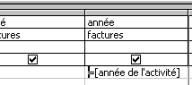 Il est possible dans une requête de filtrer manuellement les champs. Créons une nouvelle requ te l'aide de l'assistant, en utilisant la table facturier et en reprenant tous les champs les uns après les autres. Dans la zone écriture sous la colonne année, tapons "[Ann e]". Dans la même ligne mais sous la colonne "Activité ", tapons [activité]. Les pseudo champs créés ainsi nous poserons la question. Lorsque nous ex cutons la requête, Access demande d'abord Année?, puis Activité? Et affiche uniquement les données qui correspondent ces 2 critères. Le pseudo champ doit impérativementêtre en 1 seul mot, mais vous pouvez utiliser des "_" entre les mots. [Année_activit ] fonctionne. Par contre [année_de_l'activité ] ne fonctionne pas cause du caractère accentu ('). Sauvegardons cette requête sous le nom de résultat par activité .