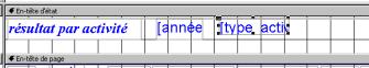 Dans la zone d'en-tête, insérons une zone de texte et dans cette zone, tapons [année_des_activités]. Nous pouvons éventuellement changer la mise en forme de ce champ (gras, hauteur supérieur. Une deuxième modification possible serait de dissocier par activités les rentrées et les sorties. Nous aurions pu le faire la création, mais faisons-le directement en mode modification. Dans le menu Affichage, s lectionnons "Trier et regrouper". Insérons le champ TYPE et tapons Oui en pied de groupe, d éplaçons TYPE entre activité et date.