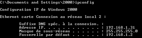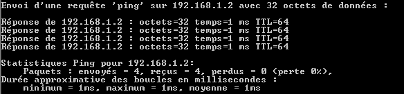 La deuxième commande, PING, va permettre de vérifier la communication effective. Sur chaque PC, tapez ping adresse de l'autre ordinateur. Dans l'exemple ci-dessus, sur l'autre PC, tapez ping 192.168.1.31. Vous devez avoir une réponse de ce type: