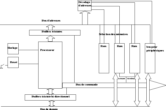 For comprehension, let us make a similarity between a microprocessor-based system with a class room. The professor represents the microprocessor and the students, the peripherals. At the time, only the processor (professor) dialogue with the peripherals (student). A student wishes to put a question, it will use a request for interruption (for example hold up the finger). To locate which student puts the question, the professor will use a table of address (correspondence number of the interruption - addresses student) to distinguish which requires among the others. Once the student clearly identified, the data bus will use to transfer information (the question). Next of the dialogue will use the address bus (distinction of the interlocutors) and the data bus. Let us suppose that the director come in the room. This director can be seen in 2 manners, as an interruption not masquable (identical to a normal interruption but the processor cannot forget to answer, to mask the question). Rather let us see this director like a request for bus (Direct Memory Access). The director (a peripheral with influence) request word (a BUSRQ). The professor finishes his sentence in progress (the instruction of the processor) and announces to the peripheral (directing) which it gives control by a BUSACK (that it releases drank them while being disconnected) and the peripheral - director will be able to speak on the electronic assembly (the class supplements or a pupil - particular peripheral).