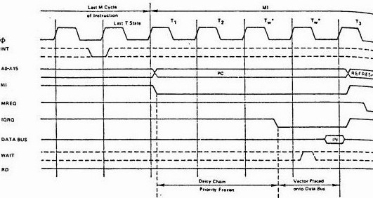 When the signal is accepted, a M1 signal is generated. During this special cycle M1, signal IORQ becomes active (in the place of the signal report MREQ), indicating that the peripheral requiring an interruption can place a data on 8 bit on the data bus. In the case of Z80, 2 instructions of waiting of office are generated, which avoids an electronic assembly to slow down the reading of the data on peripherals slower than the memory. This makes it possible the signal to be stabilized.