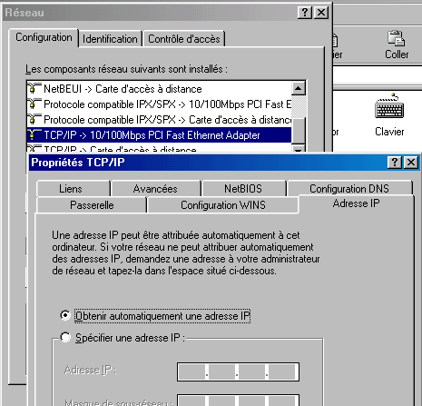Dans le cas où les adresses ne sont pas dans la même classe, vous pouvez paramétrer vos adresses manuellement. Dans Panneau de configuration -> Paramètres réseaux, sélectionnez TCP/IP carte réseaux et cliquez sur propriétés. Tapez pour chaque PC une adresse dans la même classe 192.168.1.1, 192.168.1.2, ... jusqu'à 192.168.1.254. Comme masque de sous réseau, utilisez 255.255.255.0 pour chaque station.