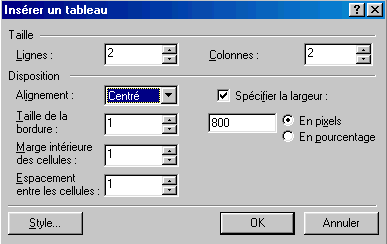 Dans le menu tableau de Frontpage, sélectionnons la commande Insérer -> Tableau.