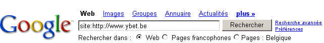 Le résultat de cette commande varie suivant l'évolution du site et du nombre de pages indexées par Google. En complétant avec 1 ou 2 mots, vous pouvez vérifier les pages du site indexées reprenant ces mots. Exemple: site:http://www.ybet.be formation.