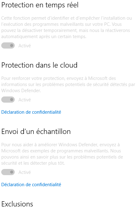 Par contre, si c'est Defender qui est utilisé, Microsoft va seulement permettre de le désactiver un cours instant avant de le réactiver. Forcément, des informations et des échantillons de problèmes potentiels peuvent être envoyés sur le site pour analyse.